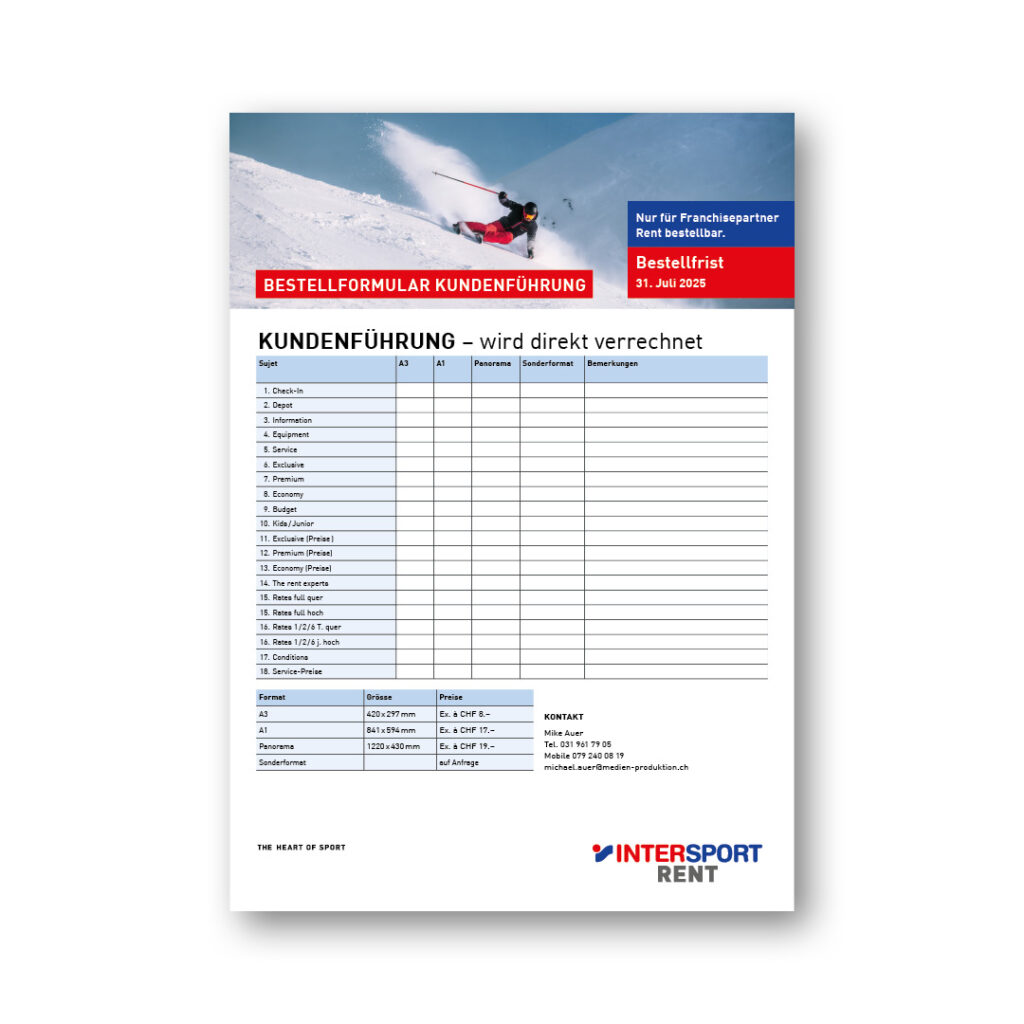 Hier kannst du den neuen Rent- Prospekt 2025/2026 und allgemeine Rent – Werbeartikel bestellen. Diese Artikel können nur INTERSPORT Rent Franchise Partner bestellen.